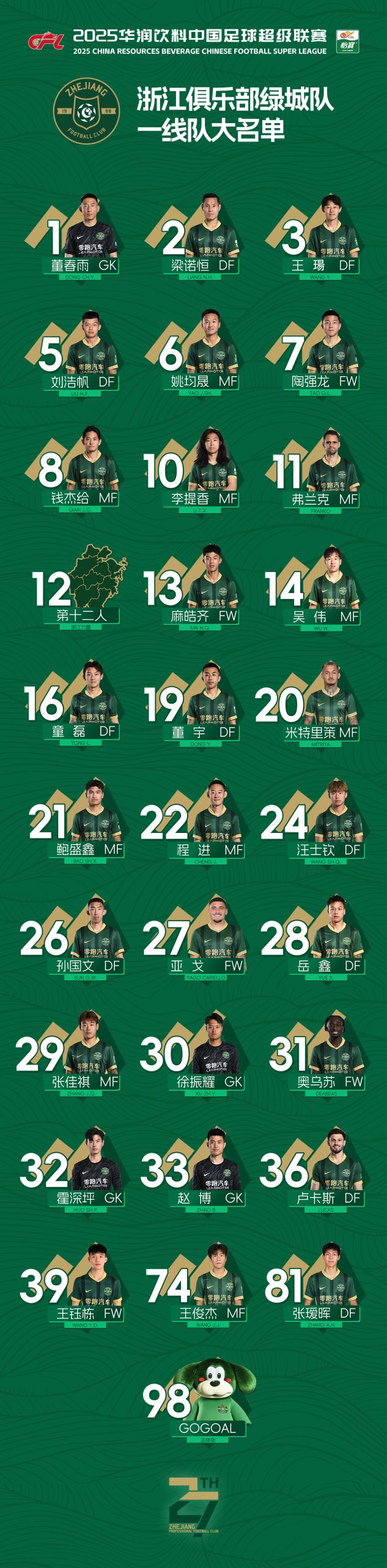 2025中超联赛浙江职业足球俱乐部一线队大名单