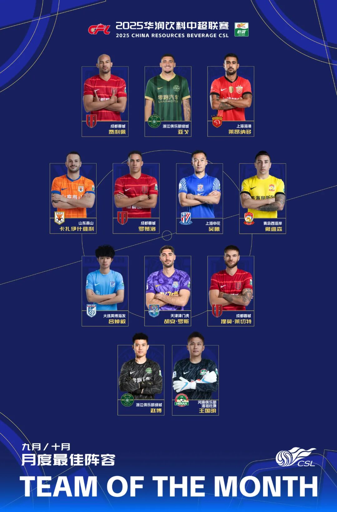 2025华润饮料中超联赛9/10月最佳阵容出炉,本次最佳阵容采用3-4-3阵型。最佳阵容名单如下: