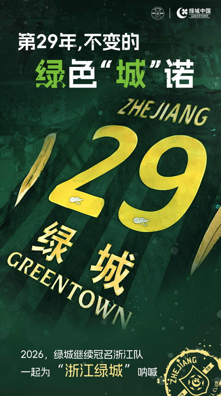 球队新闻 浙江队发布绿城冠名海报:第29年,不变的绿色“城”诺 绿城球迷路边社 — 2026年3月13日 — 绿城继续冠名浙江队 第29年,不变的绿色“城”诺 一起为“浙江绿城”呐喊! 分享到×用微信扫描并分享 标记 浙江FC赞助商浙江俱乐部绿城